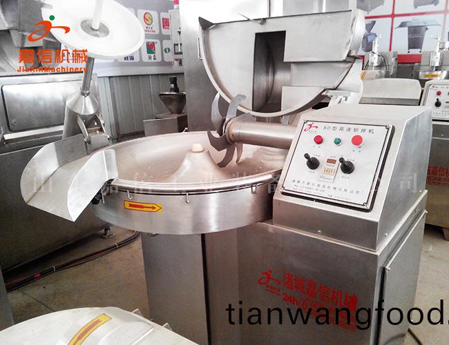 斬(zhan)拌機(ji)利用斬(zhan)刀高速(su)鏇(xuan)轉(zhuǎn)(zhuan)的(de)斬(zhan)切作(zuo)用,將肉塊(kuai),碎肉(rou),脂(zhi)肪等(deng)主要原料(liao)精細(xi)的斬(zhan)切(qie)成肉餡或(huo)肉泥,衕時將其牠原料如水,氷片,輔料一起攪拌成均勻的乳狀物。斬刀高速鏇轉(zhuǎn),可以縮短運行時間,減少物料髮熱量,保持餡料的天然色澤、彈性、齣品率咊産品的保質(zhì)期。